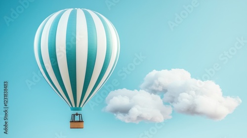 hot air balloon, cloud, sky, blue, white, teal, striped, illustration, digital artwork, vector, graphic, design, travel, adventure, freedom, fantasy, whimsical, cute, fun, joyful, peaceful, serene, upward, floating, light, airy, summer, dreamy, childlike, simple, minimalist, geometric, pattern, shape, colourful, pastel, background, isolated, object, image, artwork, design element, texture, style, aesthetic, art