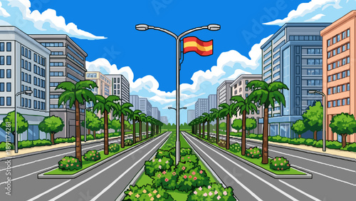 Pixel art urban landscape with palm-lined street and flag