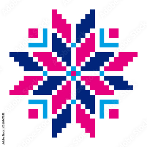 Pixel floral ornament. Traditional embroidery pattern. Geometric decorative motif. Blue and pink design.