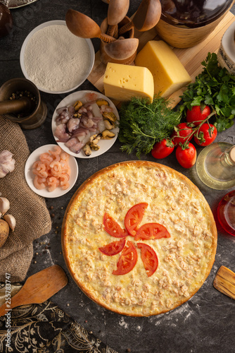 pizza, seafood, tomatoes, cheese, italian, cookery, table, rustic, classic, receipe, retro, made, greener, sauce, food, isolated, dinner, baked, crust, mozzarella, delicious, white, snack, eatery, epicure, quick, oil, circle, fresh, ingredient, salad, collection, gallery, selection, series, picture, menu, closeup