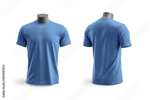 t-shirt, blue, plain, front, back, design, template, clothing, fashion, apparel, product, illustration, rendering, three-dimensional, model, mannequin, sleeve, short, casual attire, style, wear, fabric, cotton, polyester, soft, comfortable, unisex, graphic, print, logotype, brand, advertising, marketing, promotion, retail, e-business, photo, studio, isolated, white, background, realistic, visual, presentation