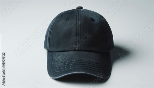 Plain dark blue navy blue denim jeans baseball cap hat front view lying on white background