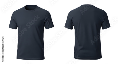 Plain navy blue t-shirt displayed from front and back, showcasing its design and fabric texture in a neutral setting