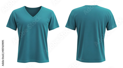 Plain Teal V-Neck T-Shirt Mockup Front and Back Views 3D Rendering on transparent background