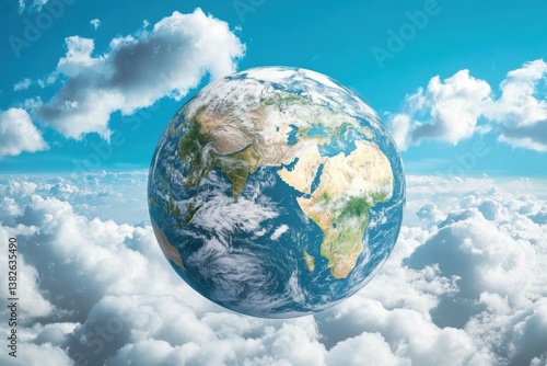 Planet Earth floating among clouds in a bright blue sky during daylight