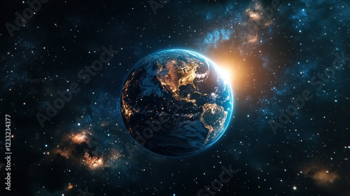 Planet Earth viewed from space with colorful cosmic backdrop and stars illuminating the vast universe