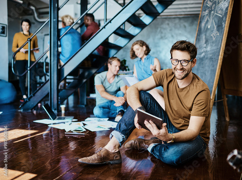 Planning, portrait and brainstorming with business man in office for collaboration, design proposal and deal. Meeting, success and startup launch with employees in creative agency for solution
