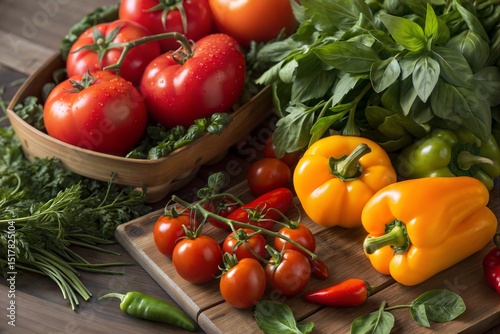 Plant based cuisine fresh vegetable Fresh vegetables including tomatoes, peppers, and herbs arranged on a wooden surface.