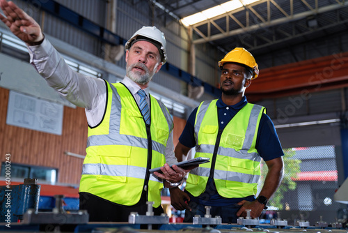 Plant manager visit engineer in factory at production line discuss on quality assurance improvement