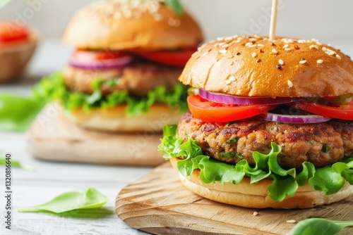 Plant-based burger topped with colorful ingredients on a neutral background.