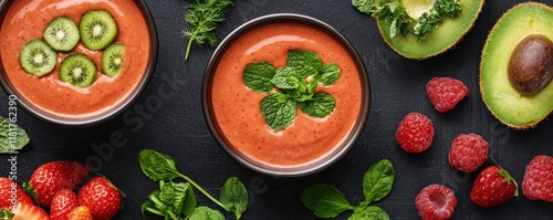 Plant-Based Cuisine with Seasonal Herbs for Vegan Living concept. Fresh, vibrant bowls of fruit and vegetable soup.