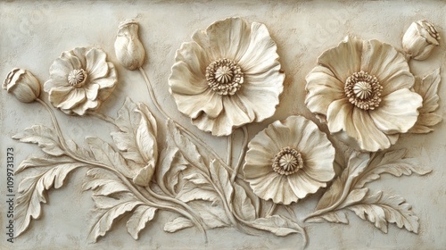 in plaster, texture, poppy, flower, stucco, relief, floral, motif, classical, design, intricate, decoration, art, aesthetic, detail, pattern, sculpture, ornament, vintage, craftsmanship, elegance, beauty, nature, botanical, surface, wall, architecture, garden, wallpaper, creativity, background, symbol, heritage, culture, artisan, colours, romantic, lush, bloom, craft, soft, element, exquisite, ornamental