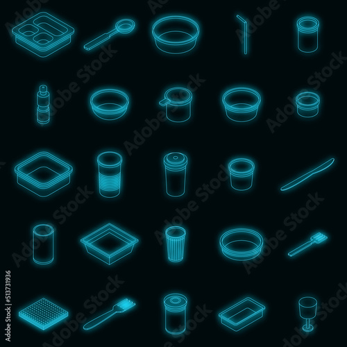 Plastic tableware icons set. Isometric set of plastic tableware vector icons neon on black