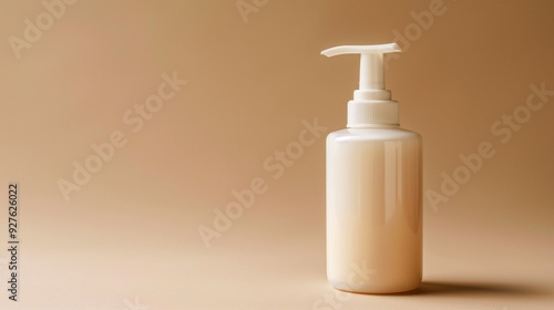 Plastic white bottle of hand lotion without a label, soap, cream, washing gel, cosmetics container, brown beige background
