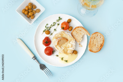 Plate of tasty baked Camembert cheese on blue background