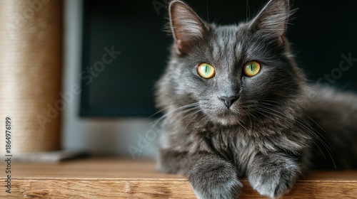 Playful cat sitting on a cat tree next to an office workstation creating a cozy and productive atmosphere
