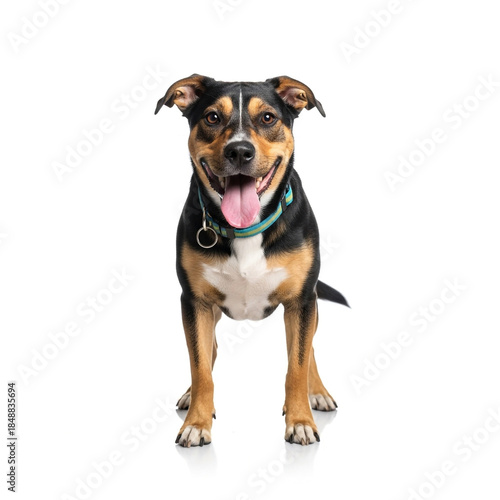 dog, pet, animal, happy, playful, colourful, collar, smiling, friendly, cute, black, brown, white, fur, ear, eye, nose, mouth, standing, isolated, white background, studio, photo, joyful, lively, energetic, affectionate, loyal, companion, mammal, domestic, doggy, canino, fun, silly, goofy, tail