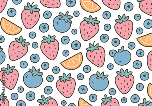 strawberry, blueberry, orange, fruit, pattern, seamless, background, sweet, berry, fresh, healthy, food, pastel, summer, print, design, playful, cute, natural, organic, wallpaper, fabric, textile, repeat, digital, texture, children, childish, bright, vibrant, fun, graphic, illustration, doodle, art, drawing, modern, simple, flat, clean, minimalistic, cartoon, tropical, mix, assorted, deliciously, colourful