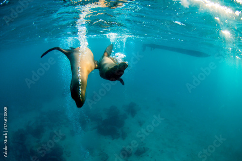 wildlife, water, vacation, travel, swim, south pacific, south america, snorkel, silhouette, sea lion, sea, aqualung, puppy, playful, ocean, nature, marin, mammal, island, galapagos, fur, exotic, evolution, ecuador, diving, darwin, bubble, blue, animal, adventure