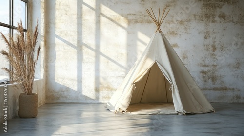 tipi, playhouse, children, children, room, interior, decor, design, rustic, natural, modern, cosy, calm, peaceful, sunlight, shadow, window, plant, grass, decorating, furniture, home, living, space, play, imagination, fun, creative, relaxation, comfort, light, neutral, simple, minimalist, organic, texture, concrete, floor, canvas, fabric, wood, warm, stylish, charming, bright, open, empty