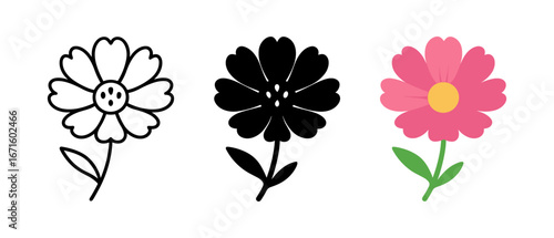 Playful trio of simple flower designs in black, white, and pink