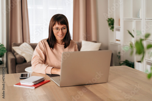 Pleasant happy young woman freelancer working on laptop at home. Attractive businesswoman in eyeglasses studying online, using laptop software, web surfing information or doing online shopping