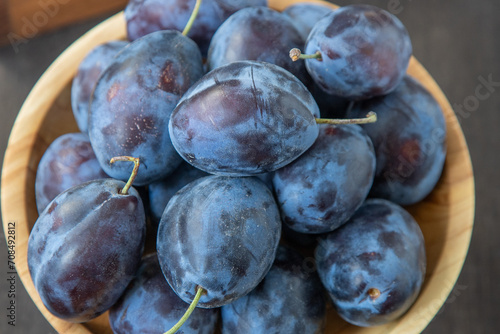 Plum variety Hungarian. Fruit harvest on the table in the kitchen. Autumn blue plum. Vitamin food bowl.