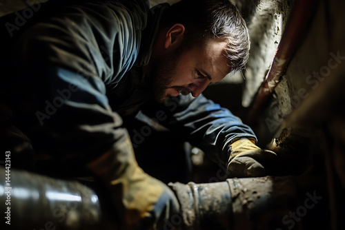 plumber, pipe, repair, maintenance, work, glove, dark, industrial, underground, manual labor, service, professional, tool