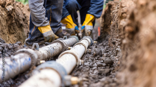 Plumbing pipeline repair construction of drinking water in autumn time concept. Workers install underground pipes for water, sewerage electricity and fiber optics for the population of an urban center