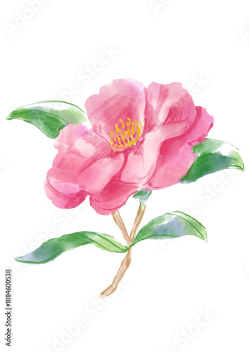 咲き誇るピンクのサザンカの花の手描きの水彩イラスト(透過PNG)