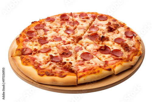 pizza, pepperoni, ham, isolated, classic, delicious, savoury, crispy, fresh, cheese, crust, italian cuisine, food photography, fast food, take-away, delivery, appetising, mouth-watering, satisfying, tasty, affordable, convenient