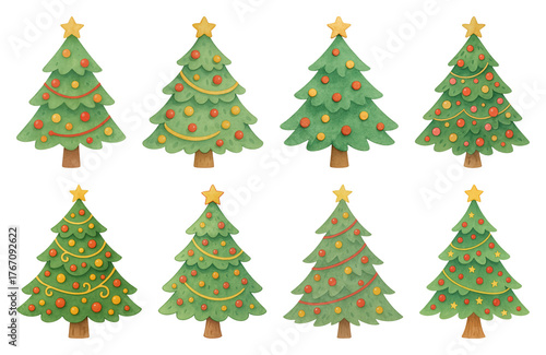 christmas ornament, holiday decorations, illustration, transparent, collection, decorative, watercolor, christmas, ornament, adorable, colourful, holliday, isolated, seasonal, element, festive, holiday, winter, green, mixed, tree, cute, pine, star, art, set, decoration