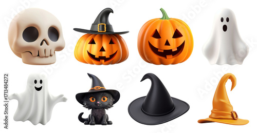 illustration, decoration, transparent, collection, black cat, halloween, isolated, cartoon, element, festive, holiday, playful, pumpkin, symbol, animal, orange, skittish, black, ghost, icon, mixed, skull, theme, sorcerer, cute, cat, hat, set, three-dimensional