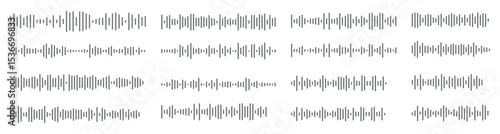 Podcast sound waves. Audio waveforms line icons, sound wave frequency or voice microphone signals. Music, podcast and broadcast, UI and audio branding design. Isolated vector set.