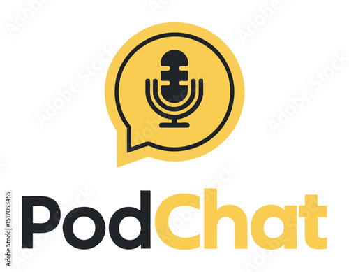 PodChat logo design with yellow speech bubble and vintage microphone icon for modern podcast branding
