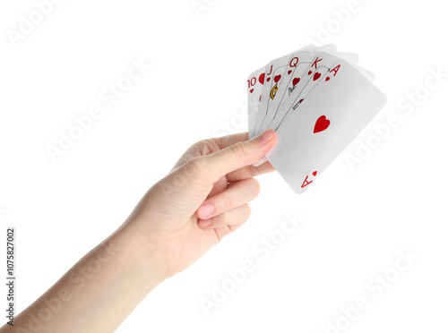 Poker game. Woman holding playing cards on white background, closeup