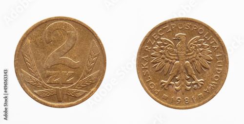 Poland - circa 1981: a tow zloty coin of Poland showing the heraldic animal of Poland the eagle with spread wings