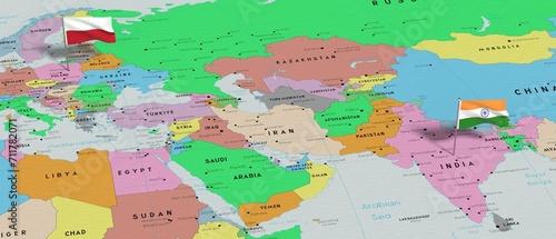 Poland and India - pin flags on political map - 3D illustration