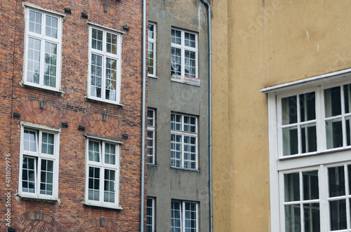 POLAND, GDANSK: Scenic cityscape view of city old center with traditional colorful architecture and red cathedral