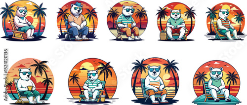 polar bear in summer dress on beach with palm trees design set vector illustration
