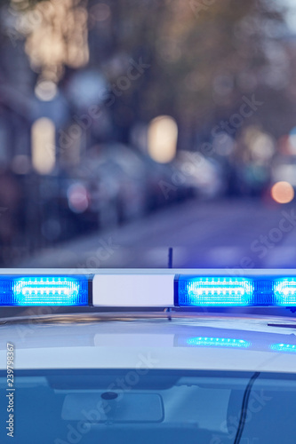 Police car with blue lights on the crime scene in traffic / urban environment.