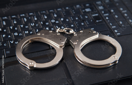 Police metal handcuffs and computer keyboard.