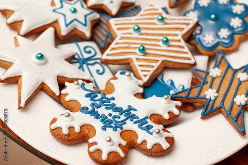 Polish Christmas gingerbread cookies decorated with royal icing with "Wesołych Świąt" writing - "Merry Christmas" wishes in Polish