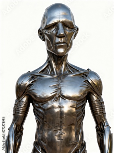 sculpture, geometric, polygonal, robot, android, ai, artificial intelligence, metal, futuristic, head, cognition, emotionless, faceted, silver, steel, anatomy, muscular, technology, emotion, power, modern art, symbolic, expressionless, concept, suppression, structure, reflective, minimalism, synthetic, armoring, science fiction, design, dominance, awareness