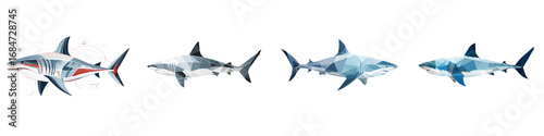 shark, shark, polygon, polygonal, geometric, sea, ocean, animal, fish, predator, marin, wildlife, illustration, art, design, graphic, isolated, white background, modern, abstract, style, blue, grey, triangle, shape, dangerous, powerful, wild, underwater, oceanic, creature, set, collection, variety, triangulation, faceted, three-dimensional