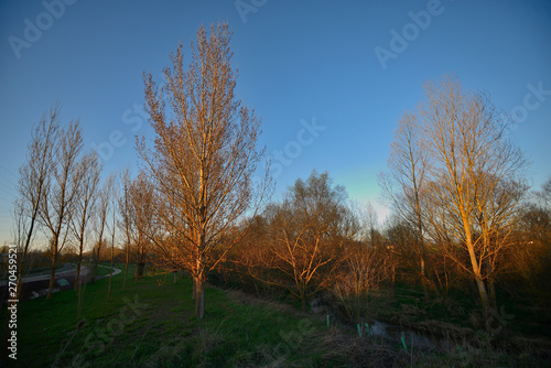 Poplars or elms at sunset in spring in the green ring of Vitoria-Gasteiz (Alava), Basque Country, Spain