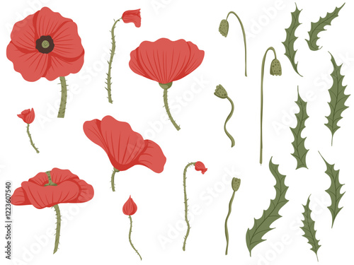 Poppy flower illustration in full blossom, with poppy pod and leaves. Vector set with red petals, green buds and leaves isolated on white.Template for branding, product, web, textile, print, packaging