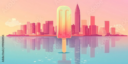 popsicle, ice, cream, summer, city, skyline, water, building, skyscraper, urban, landscape, sunset, sunrise, pink, orange, yellow, teal, blue, cool, sweet, treat, delicious, refreshing, hot, day, heat, modern, architecture, design, art, illustration, graphic, style, calm, peaceful, tranquil, vibrant, colours, gradient, minimalist, abstract, image