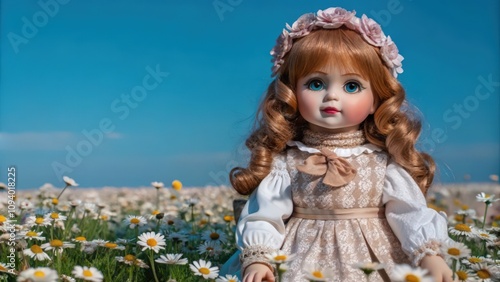 doll, porcelain, blond, hair, flower, crown, field, daisy, white, flower, blue, sky, dress, brown, bow, eye, face, ribbon, summer, girl, cute, adorable, sweet, delicate, beauty, nature, portrait, floral, innocence, childhood, happy, fashion, art, photo, vintage, romantic