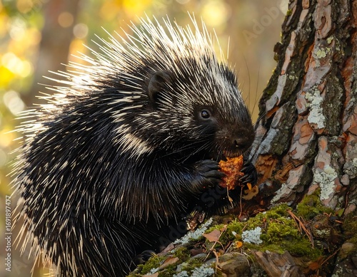 porcupine, rodent, animal, wildlife, nature, mammal, herbivore, forest, tree, bark, eating, feeding, quill, spine, defense, protection, outdoors, autumn, fall, daylight, sunlight, closeup, portrait, wild, fauna, north america, timberland, moss, lichen, tree branch, arboreal, texture, pattern, natural, environment, conservation, ecology, cute, furry, adorable, eye, curious, focused, sharp, wild animal, animal portrait, prickly, quilled